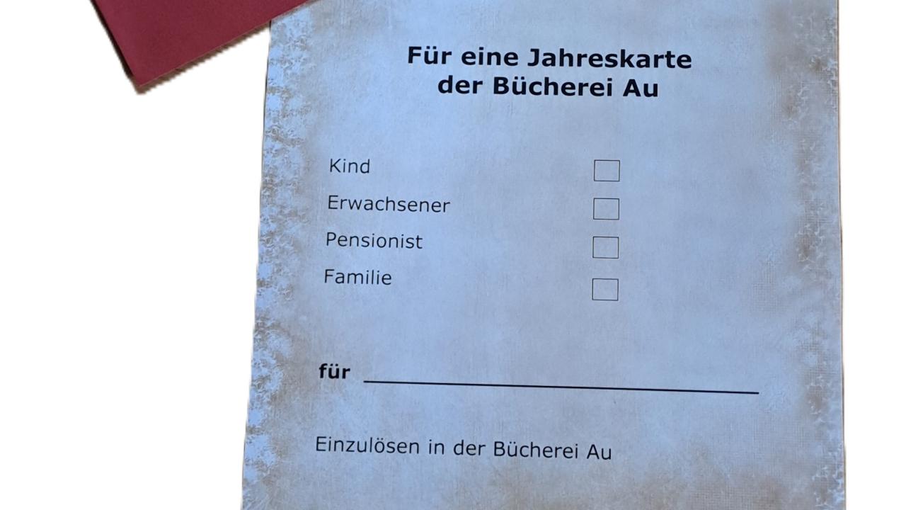 Gutscheine Noch kein Geschenk?Ein Gutschein für eine Jahreskarte der Bücherei Au passt zu Weihnachten, an Geburtstagenoder einfach so.Gutscheine in verschiedenen Ausführungen sind bei uns erhältlich.